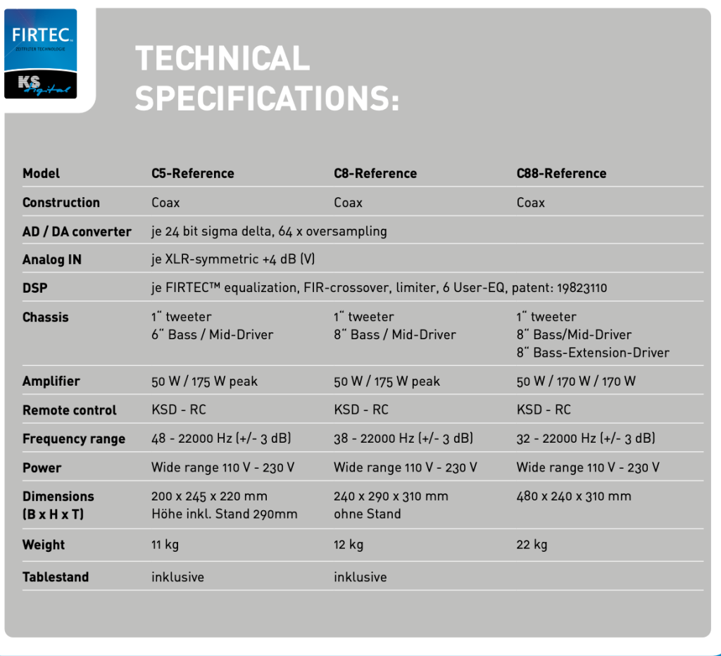 The KSD Reference series now features patented Firtec/DSP. This ensures neutral tone and correct timing. Phase linearity allows precise positioning of each instrument in the stereo sound stage. Six user filters help adjust the set-up to suit your studio.